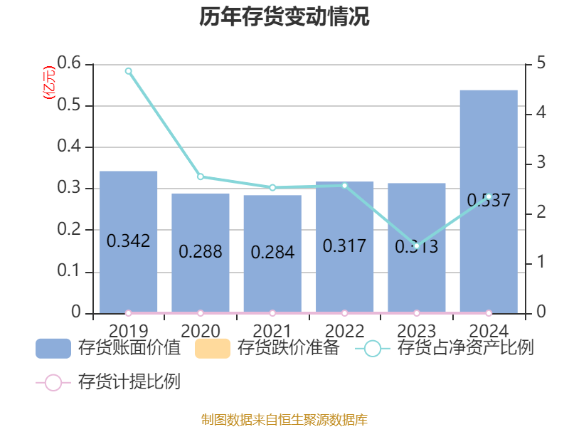 从存货变动来看,截至2024年末,公司存货账面价值为5374.11万元,占净资产的2.34%,较上年末增加2240.48万元。公司本期没有计提存货跌价准备。