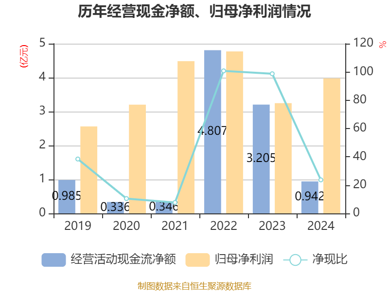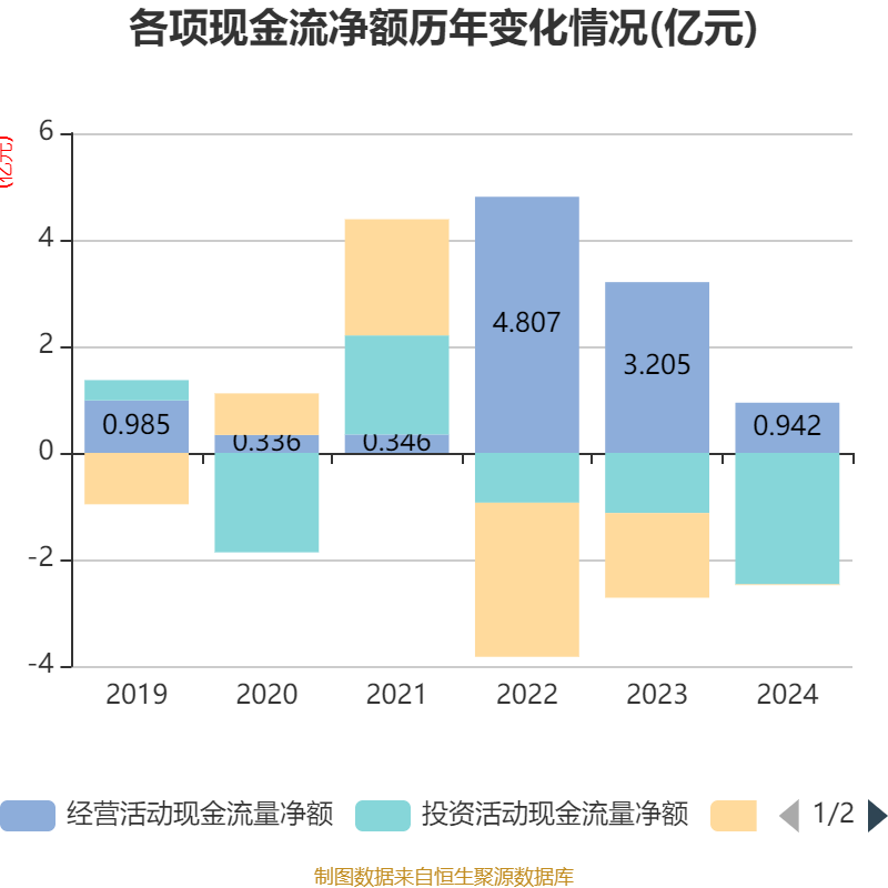截至2024年,公司经营活动现金流净额为9421.51万元,同比下降70.61%;筹资活动现金流净额-147.66万元,同比增加1.58亿元;投资活动现金流净额-2.47亿元,上年同期为-1.13亿元。