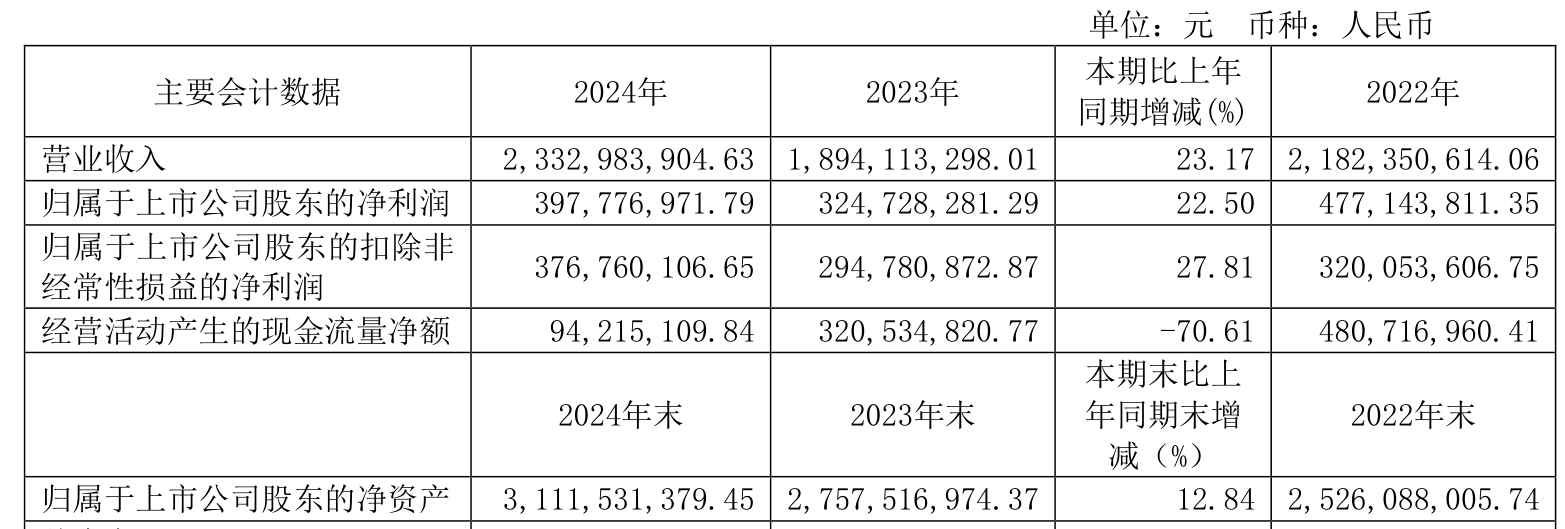 中证智能财讯皇马科技(603181)4月18日披露2024年年度报告。2024年,公司实现营业总收入23.33亿元,同比增长23.17%;归母净利润3.98亿元,同比增长22.50%;扣非净利润3.77亿元,同比增长27.81%;经营活动产生的现金流量净额为9421.51万元,同比下降70.61%;报告期内,皇马科技基本每股收益为0.7元,加权平均净资产收益率为13.66%。公司2024年度分配预案为:拟向全体股东每10股派现2.1元(含税)。