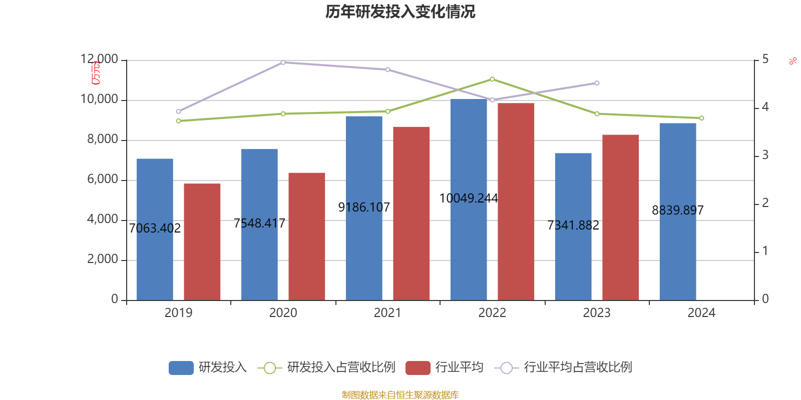 2024年全年,公司研发投入金额为8839.9万元,同比增长20.4%;研发投入占营业收入比例为3.79%,相比上年同期下降0.09个百分点。此外,公司全年研发投入资本化率为0%。
