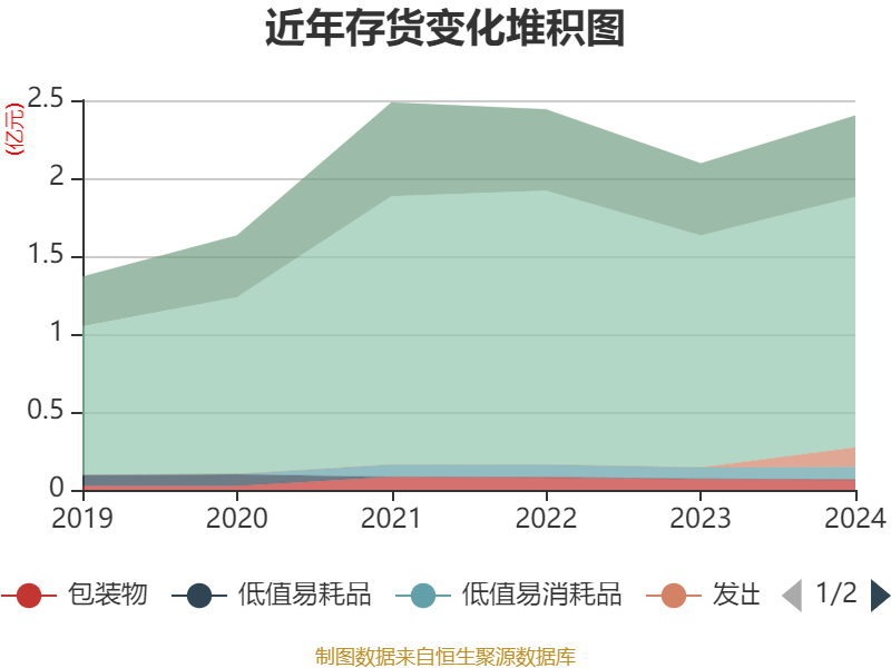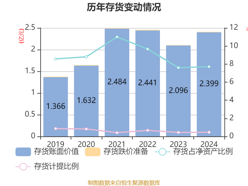 从存货变动来看,截至2024年末,公司存货账面价值为2.4亿元,占净资产的7.71%,较上年末增加3039.62万元。其中,存货跌价准备为110.05万元,计提比例为0.46%。