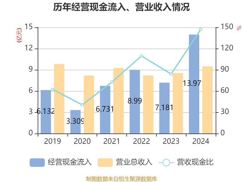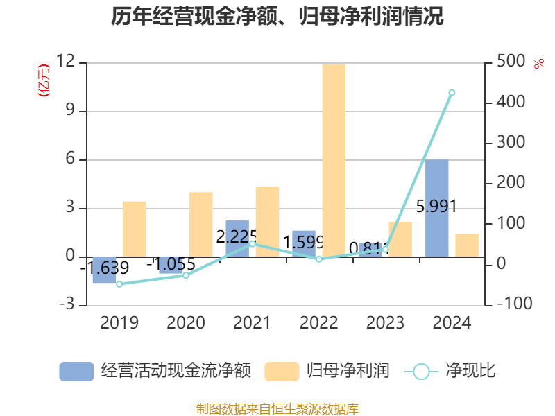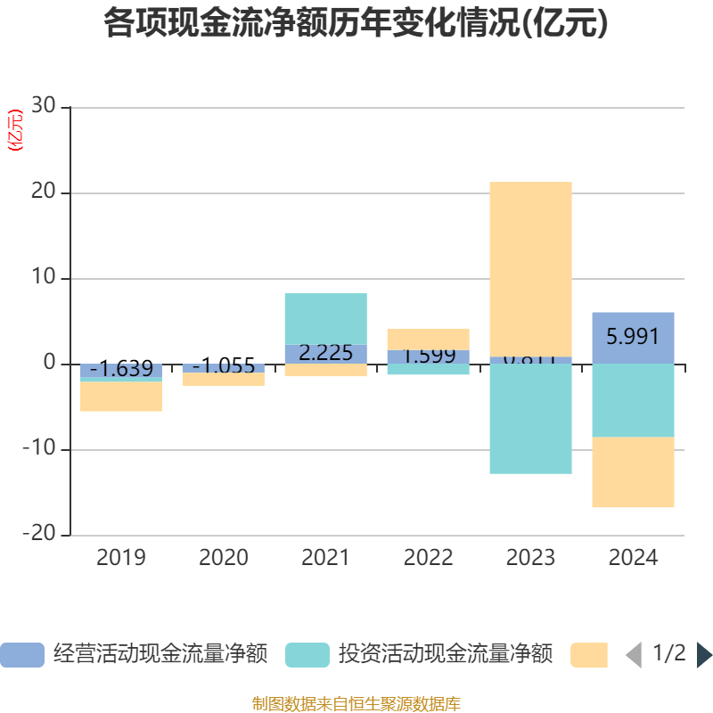 截至2024年,公司经营活动现金流净额为5.99亿元,同比增长638.76%;筹资活动现金流净额-8.19亿元,同比减少28.62亿元;投资活动现金流净额-8.61亿元,上年同期为-12.89亿元。