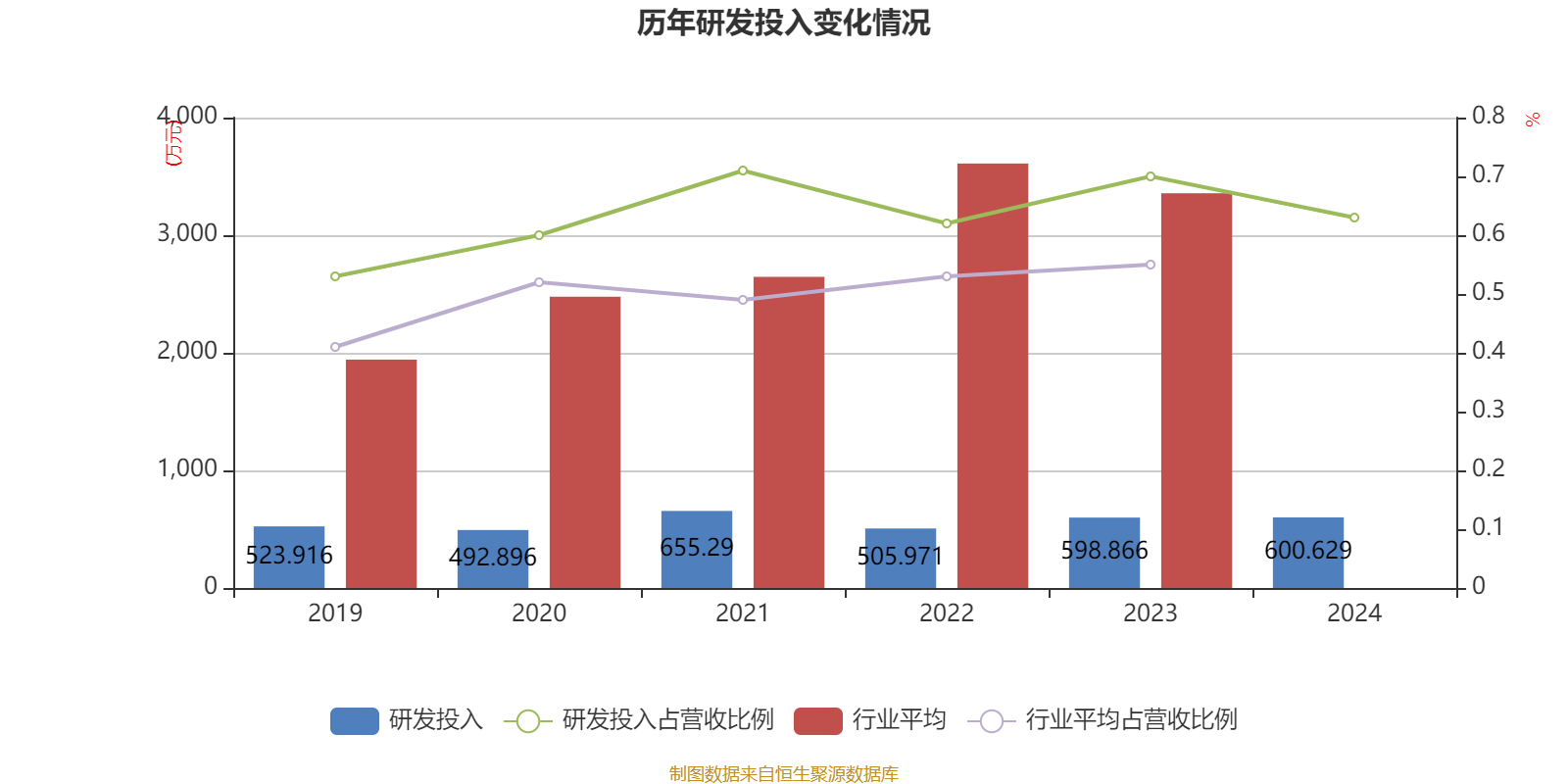 2024年全年,公司研发投入金额为600.63万元,同比增长0.29%;研发投入占营业收入比例为0.63%,相比上年同期下降0.07个百分点。此外,公司全年研发投入资本化率为14.09%。