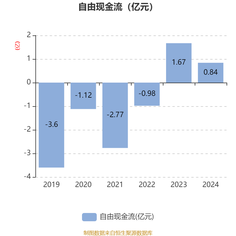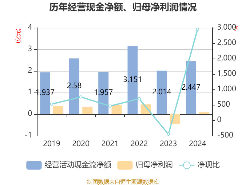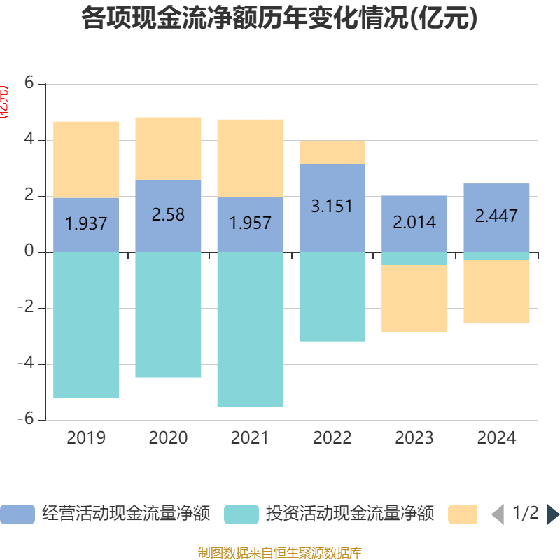 截至2024年,公司经营活动现金流净额为2.45亿元,同比增长21.53%;筹资活动现金流净额-2.24亿元,同比增加1720.78万元;投资活动现金流净额-2977.52万元,上年同期为-4513.14万元。