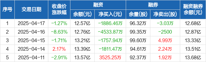 融资方面,当日融资买入2亿元,融资偿还2.18亿元,融资净偿还1886.46万元,连续4日净偿还累计9989.74万元。融券方面,融券卖出8800股,融券偿还3.91万股,融券余量96.32万股,融券余额1047万元。融资融券余额合计12.68亿元。