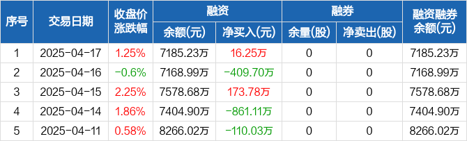 融资方面,当日融资买入876.86万元,融资偿还860.61万元,融资净买入16.25万元。融券方面,融券卖出0股,融券偿还0股,融券余量0股,融券余额0元。融资融券余额合计7185.23万元。