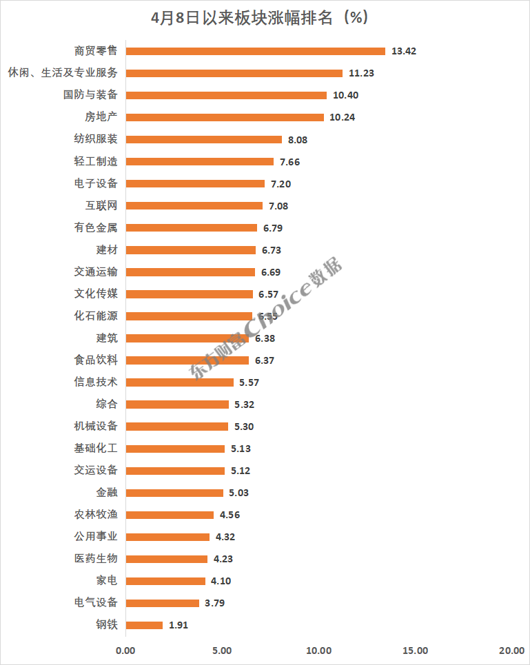 美国的不平等关税政策给我国的出口带来了很大的挑战,在出口遇阻的情况下,扩大内需被提到了更加重要的高度。Choice数据统计,4月8日以来,商贸零售涨幅13.42%,位居27个东财一级行业之首,休闲、生活及专业服务上涨11.23%,排名第二。