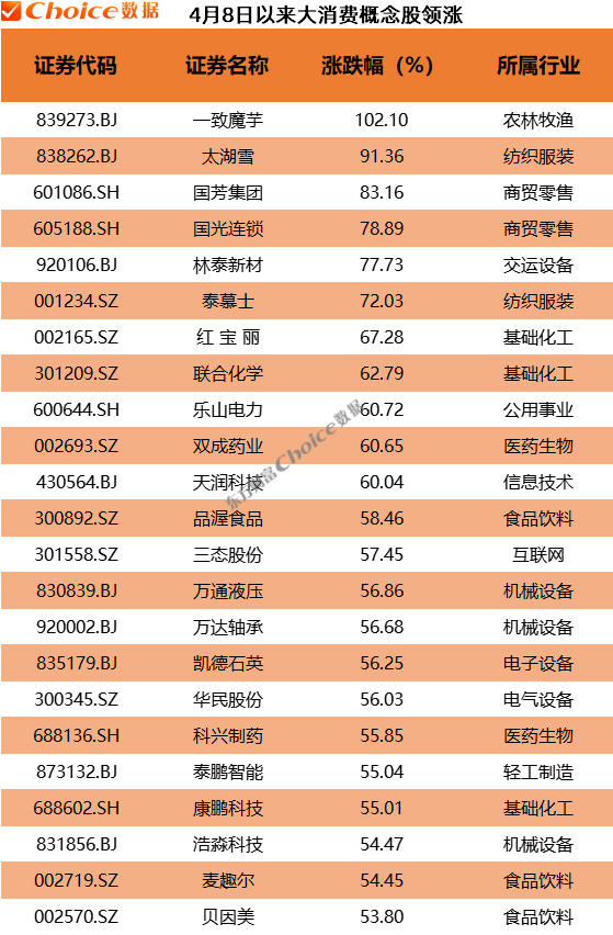 个股方面,大消费概念股霸屏。其中,一致魔芋8个交易日翻倍,Choice数据显示,一致魔芋是一家专业从事魔芋精深加工以及魔芋相关产品的研发、生产和销售的生物科技企业。聚焦于魔芋亲水胶体在美味健康食品、环保美妆材料等方面的深度研究开发应用。此外,太湖雪、国芳集团、国光连锁等消费概念股涨幅超70%。(剔除期间上市新股)