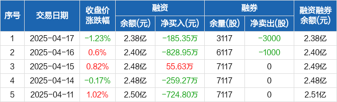 融资方面,当日融资买入433.52万元,融资偿还618.87万元,融资净偿还185.35万元。融券方面,融券卖出0股,融券偿还3000股,融券余量3117股,融券余额14.53万元。融资融券余额合计2.38亿元。