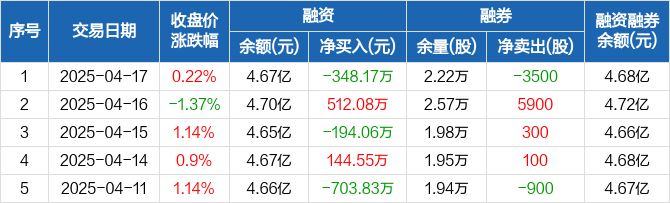 融资方面,当日融资买入2245.21万元,融资偿还2593.38万元,融资净偿还348.17万元。融券方面,融券卖出1200股,融券偿还4700股,融券余量2.22万股,融券余额99.19万元。融资融券余额合计4.68亿元。