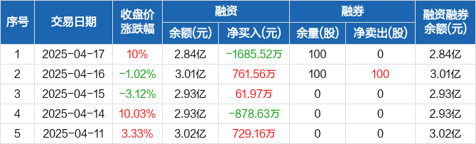 融资方面,当日融资买入1439.9万元,融资偿还3125.42万元,融资净偿还1685.52万元。融券方面,融券卖出0股,融券偿还0股,融券余量100股,融券余额2234元。融资融券余额合计2.84亿元。