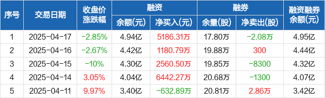 融资方面,当日融资买入1.99亿元,融资偿还1.47亿元,融资净买入5186.31万元,净买入额两市排名第20,连续4日净买入累计1.54亿元。融券方面,融券卖出100股,融券偿还2.09万股,融券余量17.8万股,融券余额163.58万元。融资融券余额合计4.95亿元。