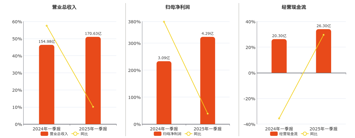 公司营业总收入为170.63亿元。归母净利润为4.29亿元。经营活动现金净流入为26.30亿元。