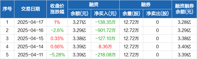 融资方面,当日融资买入3849.78万元,融资偿还3988.13万元,融资净偿还138.35万元,连续3日净偿还累计1167.17万元。融券方面,融券卖出0股,融券偿还0股,融券余量12.72万股,融券余额38.54万元。融资融券余额合计3.28亿元。