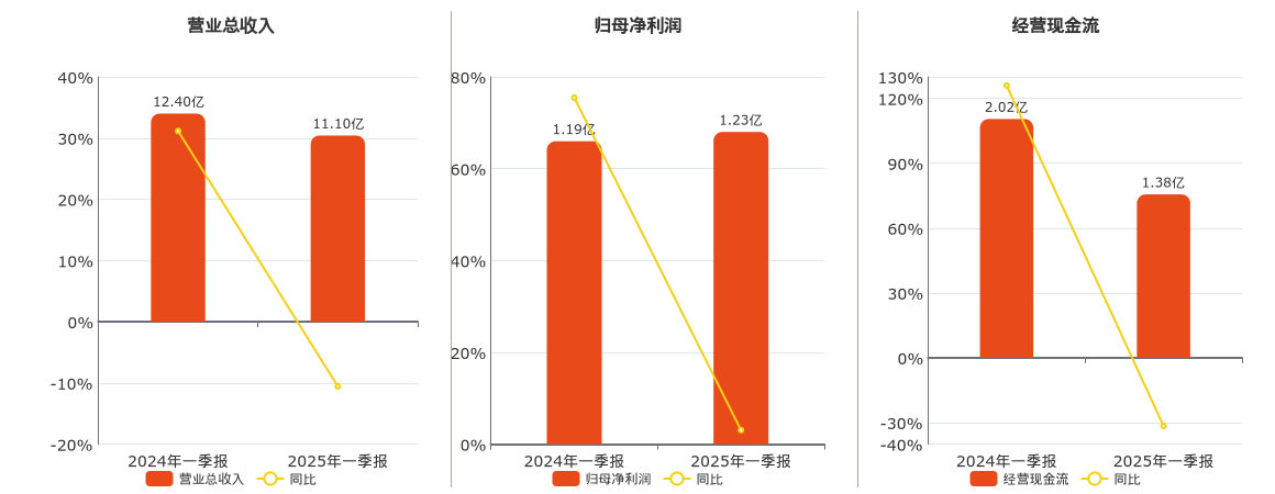 公司营业总收入为11.10亿元,较去年同报告期营业总收入减少1.31亿元,同比较去年同期下降10.55%。归母净利润为1.23亿元。经营活动现金净流入为1.38亿元,较去年同报告期经营活动现金净流入减少6380.74万元,同比较去年同期下降31.59%。