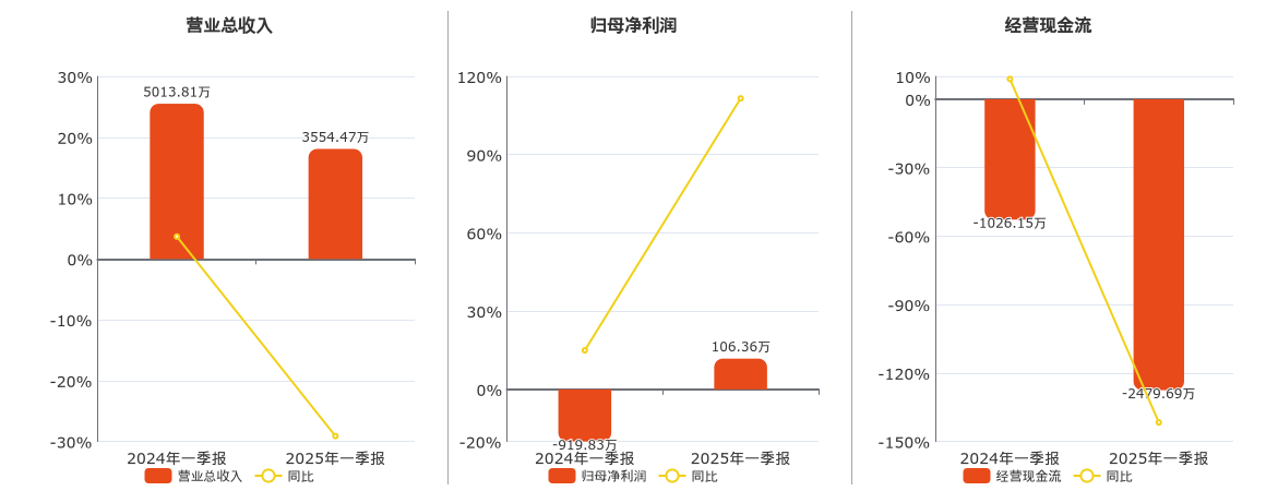 公司营业总收入为3554.47万元,较去年同报告期营业总收入减少1459.35万元,同比较去年同期下降29.11%。归母净利润为106.36万元。经营活动现金净流入为-2479.69万元,较去年同报告期经营活动现金净流入减少1453.55万元。