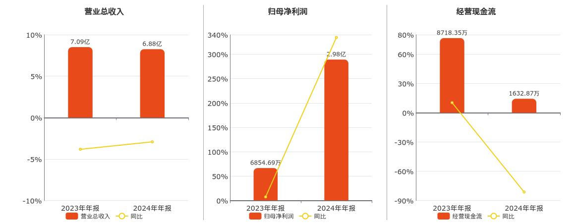 公司营业总收入为6.88亿元。归母净利润为2.98亿元,较去年同报告期归母净利润增加2.29亿元,实现2年连续上涨,同比较去年同期上涨334.35%。经营活动现金净流入为1632.87万元。