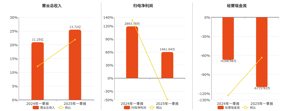 公司营业总收入为13.72亿元。归母净利润为1461.04万元,较去年同报告期归母净利润减少1432.75万元,同比较去年同期下降49.51%。经营活动现金净流入为-6715.42万元,较去年同报告期经营活动现金净流入减少2606.94万元。