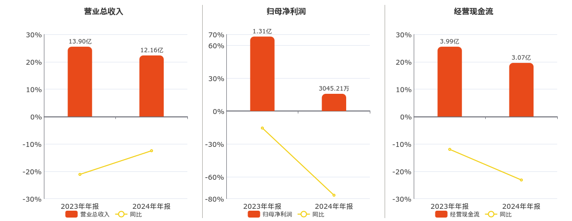 公司营业总收入为12.16亿元,较去年同报告期营业总收入减少1.73亿元,同比较去年同期下降12.48%。归母净利润为3045.21万元,较去年同报告期归母净利润减少1.01亿元,同比较去年同期下降76.81%。经营活动现金净流入为3.07亿元,较去年同报告期经营活动现金净流入减少9247.46万元,同比较去年同期下降23.16%。
