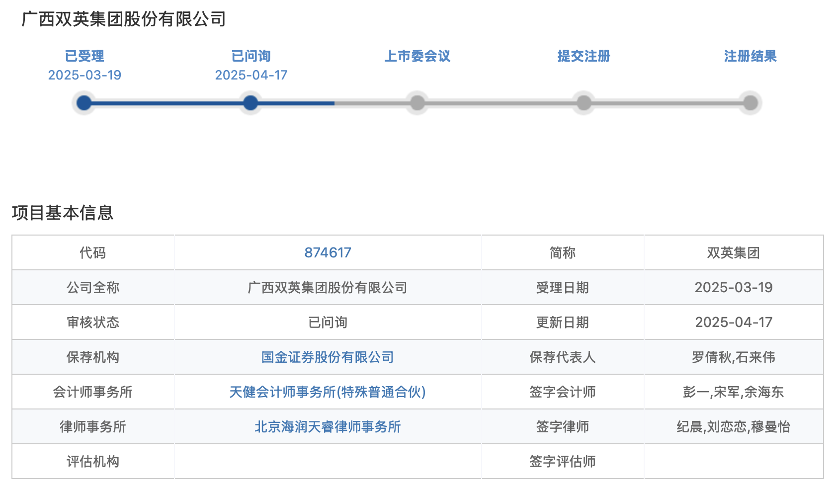 4月17日,根据北交所审核项目动态,广西双英集团股份有限公司(简称“双英集团”)IPO审核状态为“已问询”。3月19日,双英集团向北交所递交了上市招股书并获受理,保荐人为国金证券。