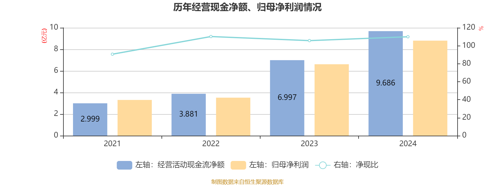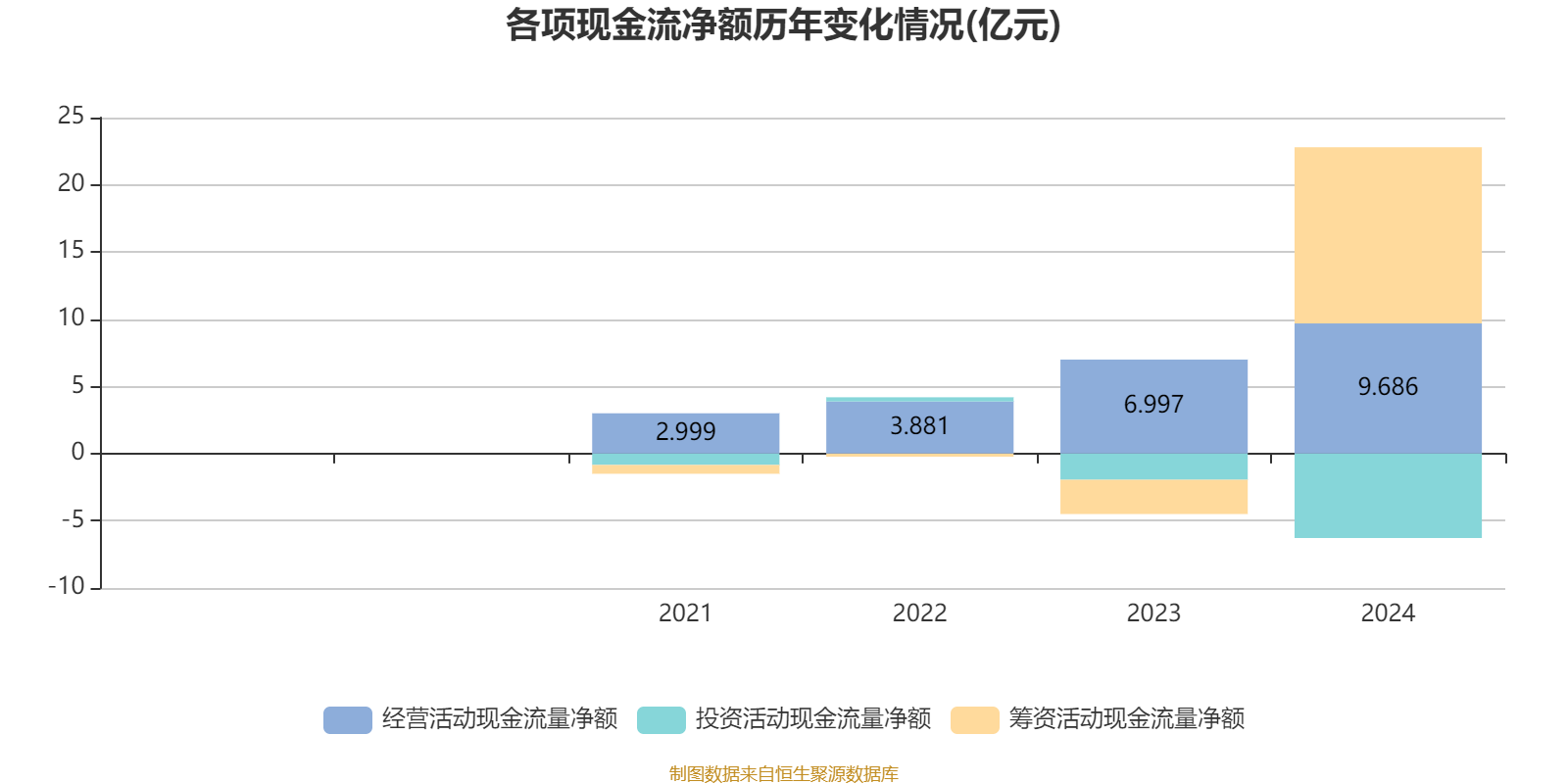 2024年,公司经营活动现金流净额为9.69亿元,同比增长38.43%;筹资活动现金流净额13.11亿元,同比增加15.66亿元;投资活动现金流净额-6.28亿元,上年同期为-1.95亿元。