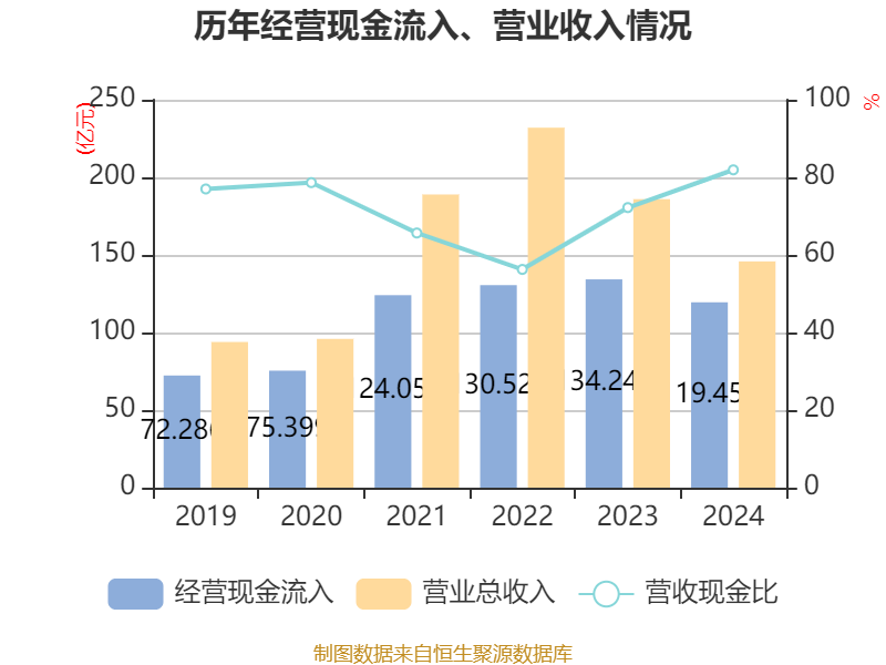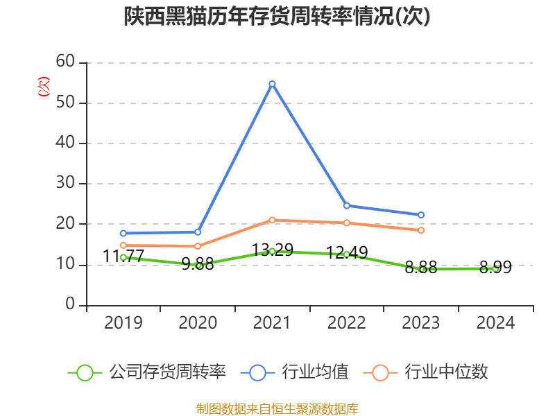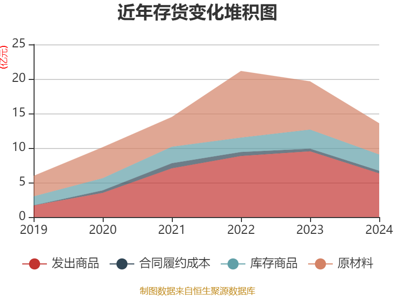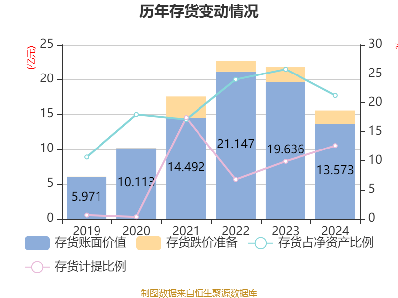 从存货变动来看,截至2024年末,公司存货账面价值为13.57亿元,占净资产的21.23%,较上年末减少6.06亿元。其中,存货跌价准备为1.96亿元,计提比例为12.59%。