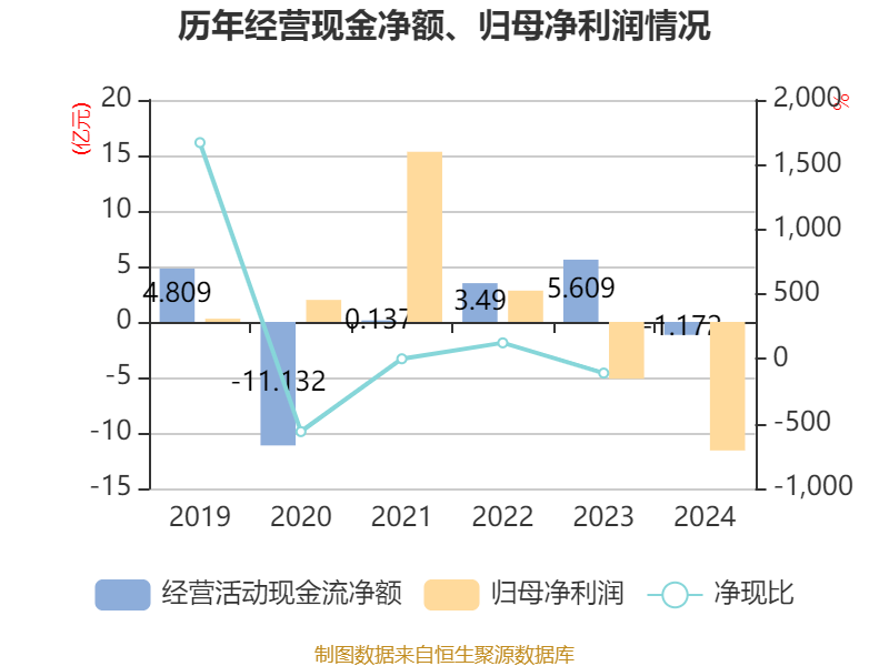 截至2024年,公司经营活动现金流净额为-1.17亿元,同比减少6.78亿元;筹资活动现金流净额5.34亿元,同比增加14.03亿元;投资活动现金流净额-5.13亿元,上年同期为7416.88万元。