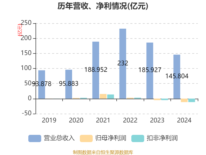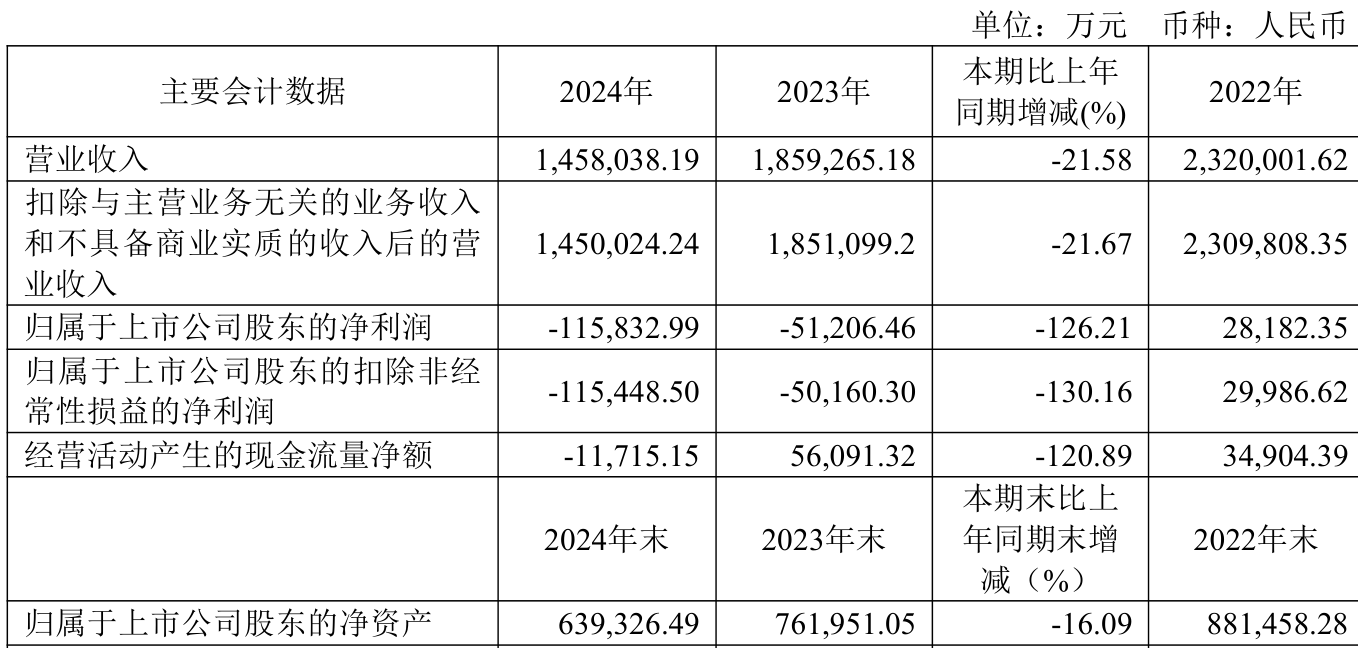 中证智能财讯陕西黑猫(601015)4月18日披露2024年年度报告。2024年,公司实现营业总收入145.8亿元,同比下降21.58%;归母净利润亏损11.58亿元,上年同期亏损5.12亿元;扣非净利润亏损11.54亿元,上年同期亏损5.02亿元;经营活动产生的现金流量净额为-1.17亿元,上年同期为5.61亿元;报告期内,陕西黑猫基本每股收益为-0.57元,加权平均净资产收益率为-16.53%。