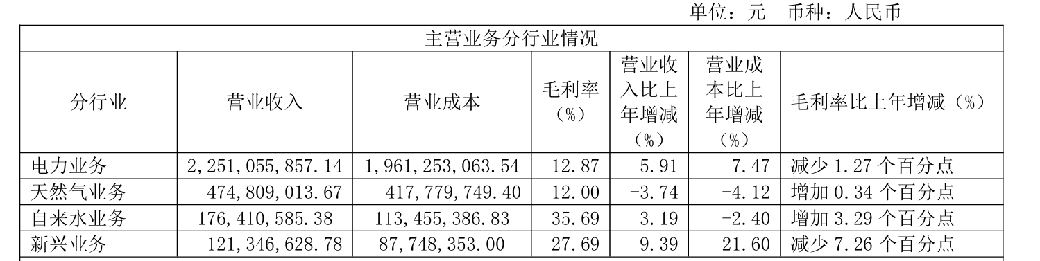 具体业务来看,2024年,公司电力业务贡献22.51亿元营收,毛利率同比减少1.27%;天然气业务的毛利率虽同比有所增长,但营收下滑了3.74%;自来水业务营收和毛利率均有所增长。