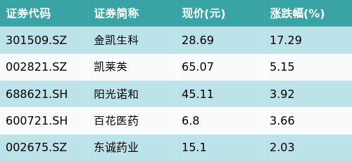截至早盘收盘,CRO/CMO主题涨跌幅最高的五只股票为:金凯生科(301509.SZ)、凯莱英(002821.SZ)、阳光诺和(688621.SH)、百花医药(600721.SH)与东诚药业(002675.SZ)。详情见下表: