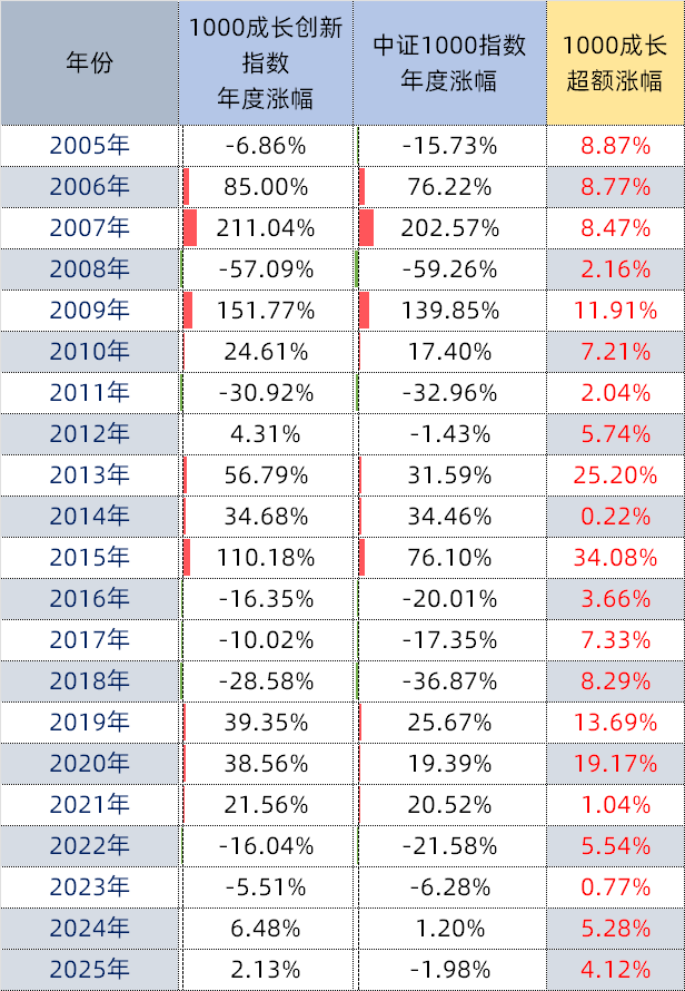 从指数历史表现来看,2005年至2024年连续20年跑赢中证1000指数,策略已经受多轮牛熊考验。今年以来1000成长创新指数上涨2.13%,同期中证1000指数下跌1.98%,超额涨幅达4.12个百分点。