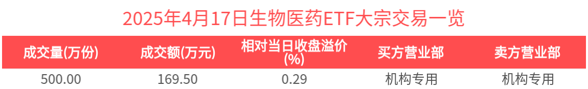 2025年4月17日,生物医药ETF(159859.SZ)收平,发生1笔溢价大宗交易,成交价为0.34元,较当日收盘价溢价0.29%。成交额为169.50万元,居可比基金首位。