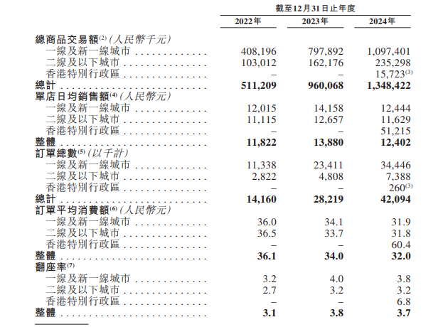 但《财中社》同时注意到,不仅翻台率开始向下降,遇见小面订单均价在下降,单店销售额也没有多少增加。2022年,公司订单平均消费额为36.1元,2024年一路下降至32元。同期,单店日均销售从11822元增加至12402元,增加了580元,但是,不得不说的是,2022年尚处于疫情影响期间,2024年则无此影响。