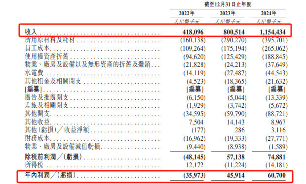 招股书显示,遇见小面收入在快速增长。2022-2024年公司实现营收4.2亿元、8亿元和11.5亿元,最近两年同比增长了91.5%和44.2%。利润方面,2022年公司亏损3597万元,2023年和2024年分别盈利4591万元和6070万元。
