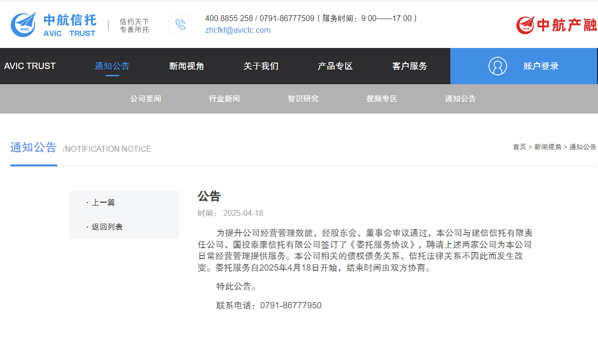 中航信托股份有限公司发布相关公告,为提升公司经营管理效能,经股东会、董事会审议通过,本公司与建信信托有限责任公司(简称“建信信托”)、国投泰康信托有限公司(简称“国投泰康信托”)签订了《委托服务协议》,聘请上述两家公司为本公司日常经营管理提供服务。本公司相关的债权债务关系、信托法律关系不因此而发生改变。委托服务自2025年4月18日开始,结束时间由双方协商。