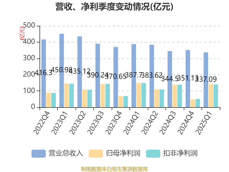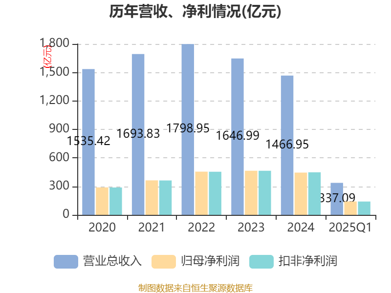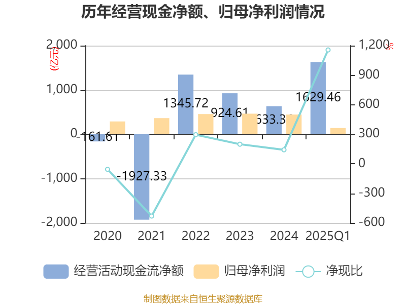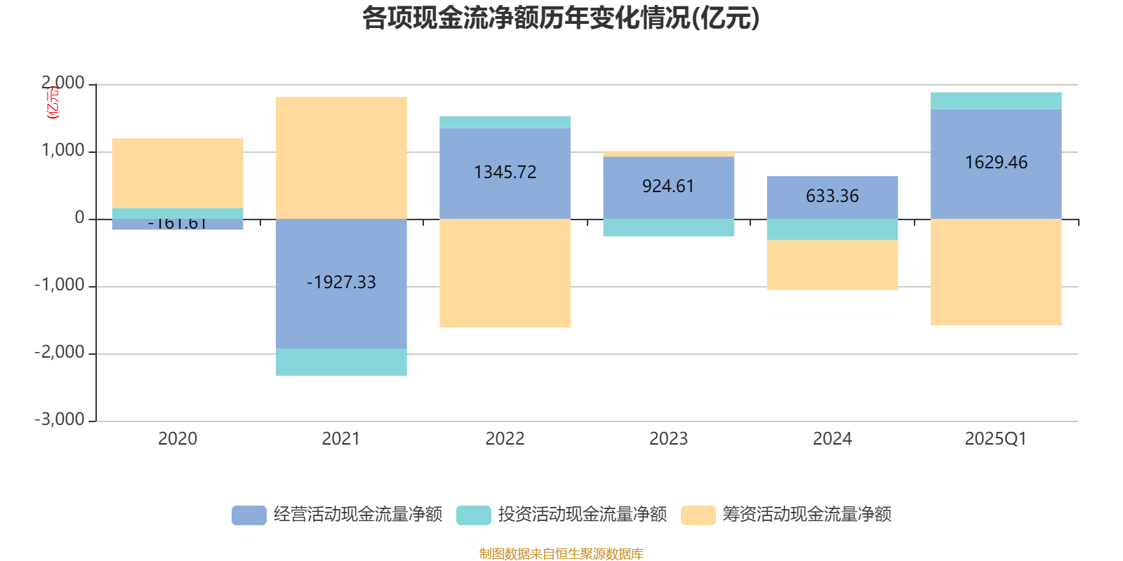 截至2025年一季度末,公司经营活动现金流净额为1629.46亿元,同比增加1843.28亿元;筹资活动现金流净额-1583.98亿元,同比减少1811.99亿元;投资活动现金流净额249.43亿元,上年同期为83.11亿元。
