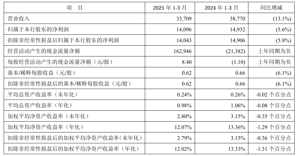 中证智能财讯平安银行(000001)披露2025年第一季度报告。公司实现营业总收入337.09亿元,同比下降13.05%;归母净利润140.96亿元,同比下降5.60%;扣非净利润140.43亿元,同比下降5.79%;经营活动产生的现金流量净额为1629.46亿元,上年同期为-213.82亿元;报告期内,平安银行基本每股收益为0.62元,加权平均净资产收益率为2.80%。