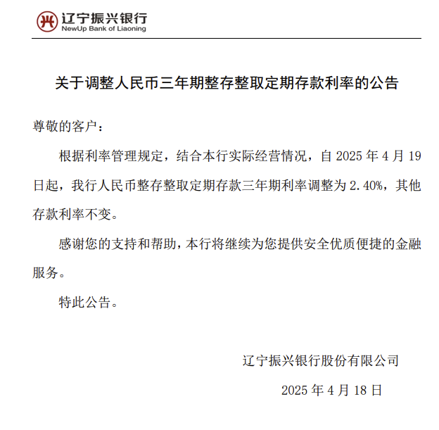 4月18日,辽宁振兴银行股份有限公司发布公告称,根据利率管理规定,结合本行实际经营情况,自2025年4月19日起,人民币整存整取定期存款三年期利率调整为2.40%,其他存款利率不变。