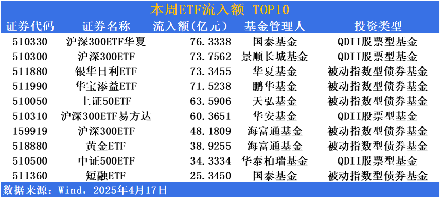 具体资金流入方面,本期(2025年4月14日-4月17日),沪深300相关ETF备受大资金青睐,沪深300ETF华夏(510330)、沪深300ETF(510300)本期流入超70亿,沪深300ETF易方达本期流入超60亿。