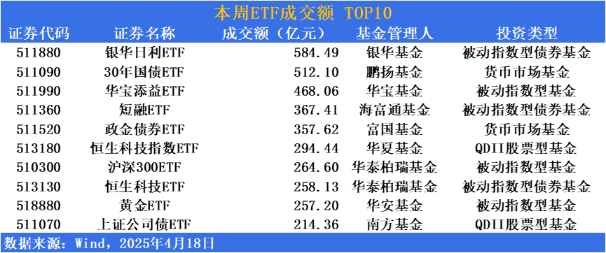 成交额方面,防守类基金交投活跃,银华日利ETF(511880)周成交额达584.49亿元,位居榜首。30年国债ETF(511090)、华宝添益ETF(511990)成交额分别为512.1亿与468.06亿。