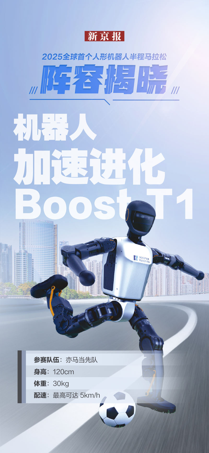 加速进化Boost T1为亦马当先队的参赛机器人,身高120cm,体重约30kg,最高配速为5km/h。它主打轻巧灵活、皮实耐摔,拥有全向行走、摔倒爬起、踢球、行走抗扰等运动能力,特别是在踢球时具备抗冲击能力,即使碰撞也能保持稳定。在马拉松赛场上,它能精准模拟人类跑步姿态,保持稳定的速度和平衡。其搭载的先进运动控制算法,可实现一秒内摔倒起立,还能实时分析赛道情况,自动调整步伐和节奏。