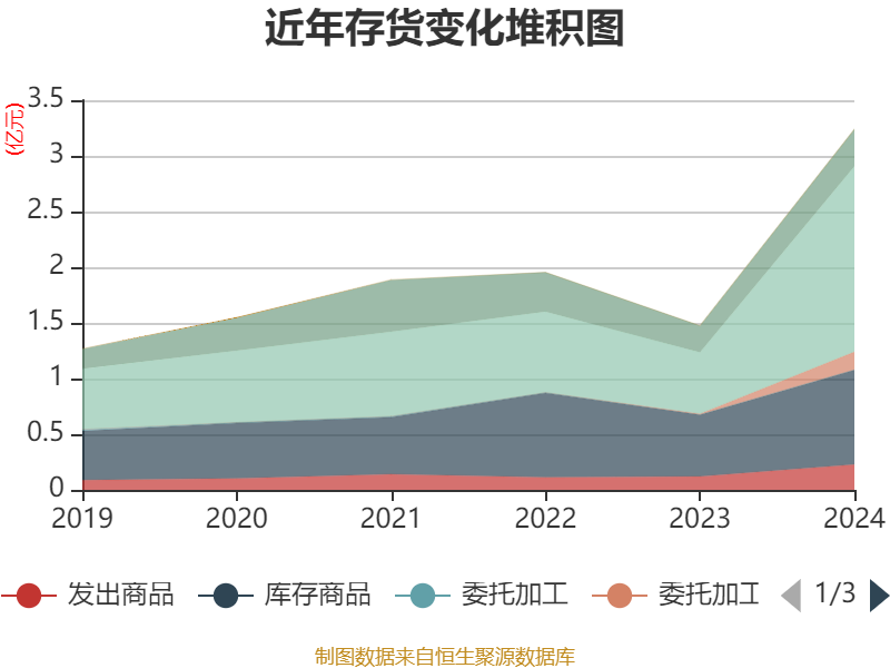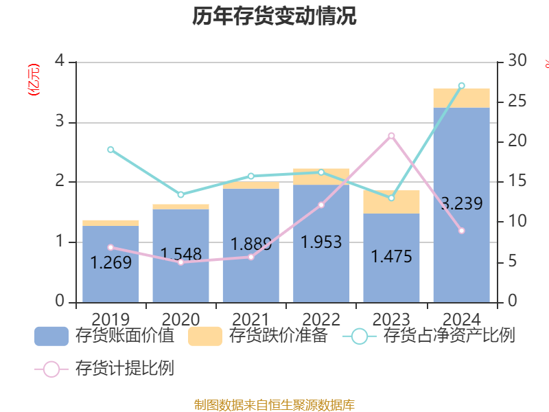 从存货变动来看,截至2024年末,公司存货账面价值为3.24亿元,占净资产的27.02%,较上年末增加1.76亿元。其中,存货跌价准备为3173.71万元,计提比例为8.92%。
