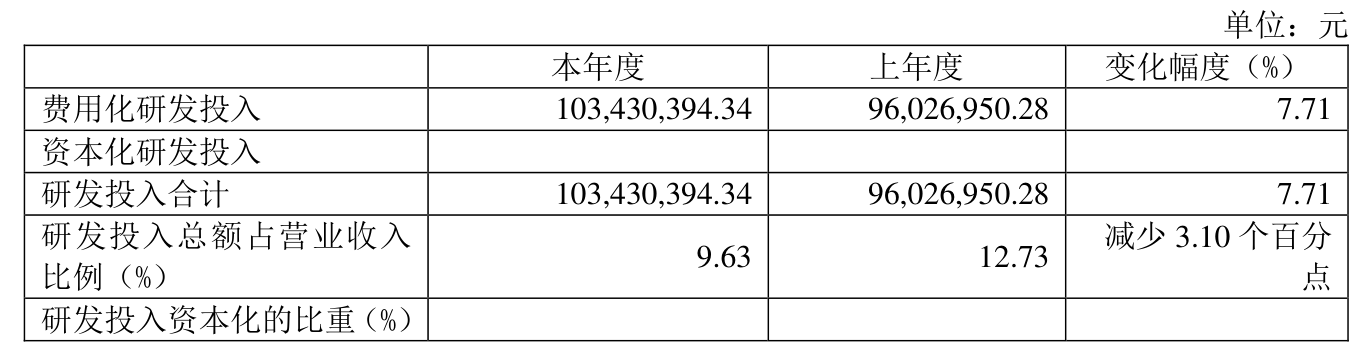 2024年全年,公司研发投入金额为1.03亿元,同比增长7.71%;研发投入占营业收入比例为9.63%,相比上年同期下降3.1个百分点。