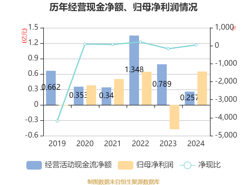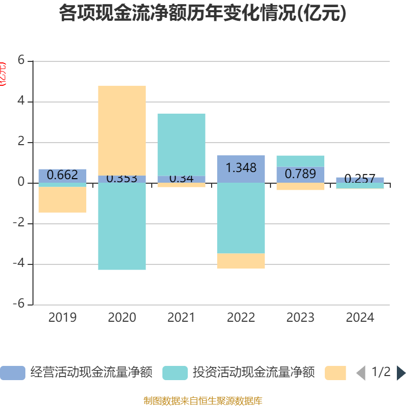 截至2024年,公司经营活动现金流净额为2565.71万元,同比下降67.49%;筹资活动现金流净额-176.78万元,同比增加3404.02万元;投资活动现金流净额-2889.25万元,上年同期为5439.16万元。