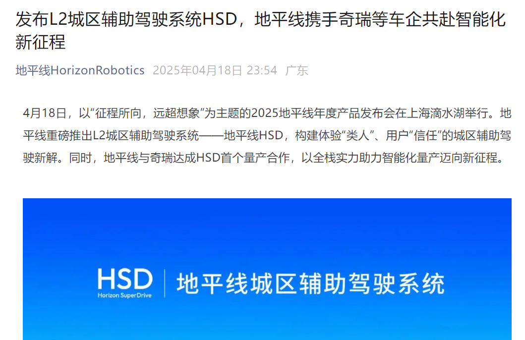 每经AI快讯,4月18日,以“征程所向,远超想象”为主题的2025地平线年度产品发布会在上海滴水湖举行。地平线重磅推出L2城区辅助驾驶系统——地平线HSD。同时,地平线与奇瑞达成HSD首个量产合作,以全栈实力助力智能化量产迈向新征程。