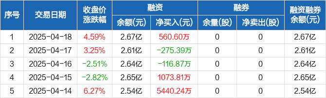融资方面,当日融资买入4243.61万元,融资偿还3683.01万元,融资净买入560.6万元。融券方面,融券卖出0股,融券偿还0股,融券余量0股,融券余额0元。融资融券余额合计2.67亿元。