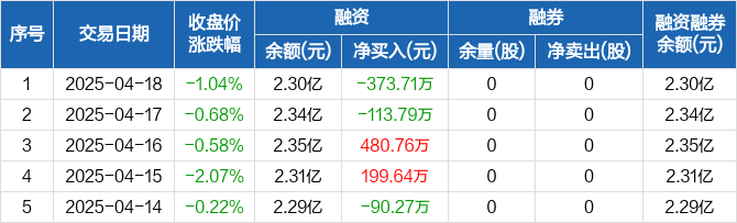 融资方面,当日融资买入800.41万元,融资偿还1174.12万元,融资净偿还373.71万元。融券方面,融券卖出0股,融券偿还0股,融券余量0股,融券余额0元。融资融券余额合计2.3亿元。