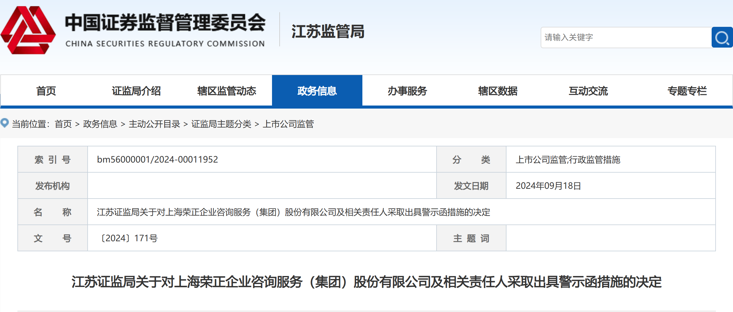 江苏证监局表示,荣正咨询及经办人吴慧珠在对鹏鹞环保出具独立财务顾问报告时未能勤勉尽责,发表的专业意见存在虚假记载,决定对荣正咨询及相关人员采取出具警示函的行政监管措施,并记入证券期货市场诚信档案。