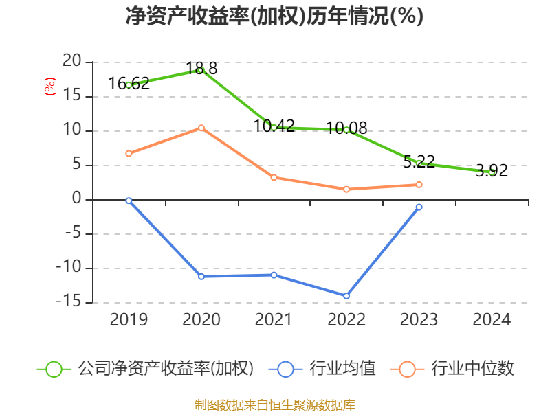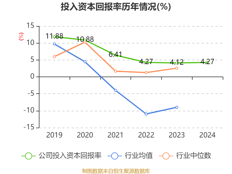 数据显示,2024年公司加权平均净资产收益率为3.92%,较上年同期下降1.3个百分点。公司2024年投入资本回报率为4.27%,较上年同期上升0.15个百分点。