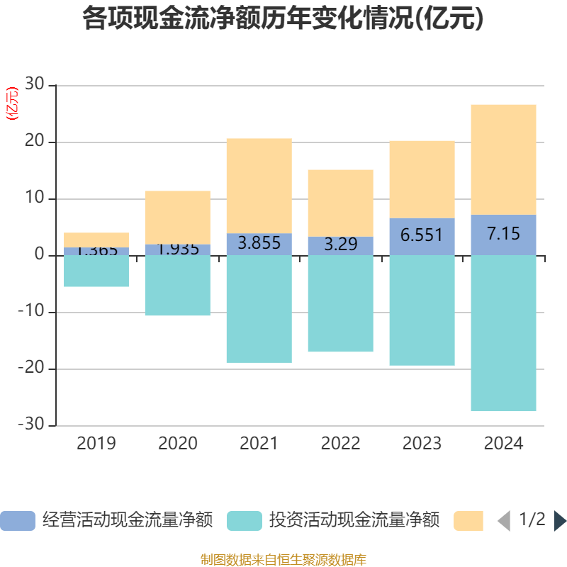 截至2024年,公司经营活动现金流净额为7.15亿元,同比增长9.15%;筹资活动现金流净额19.39亿元,同比增加5.78亿元;投资活动现金流净额-27.51亿元,上年同期为-19.47亿元。